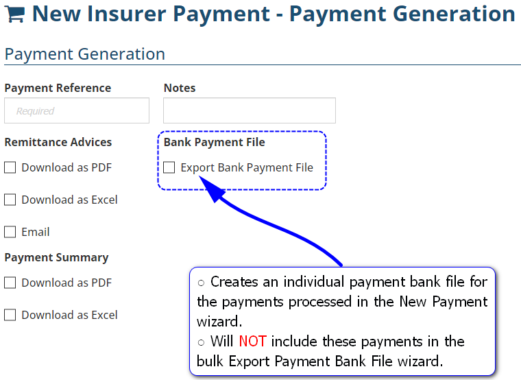 INSIGHT allows you to create an individual payment bank file for payments processed via the New Payment wizard or include the payments in a bulk payment bank file along with other entity payments via the Export Payment Bank File wizard. | ![]() |