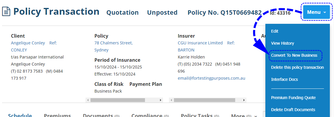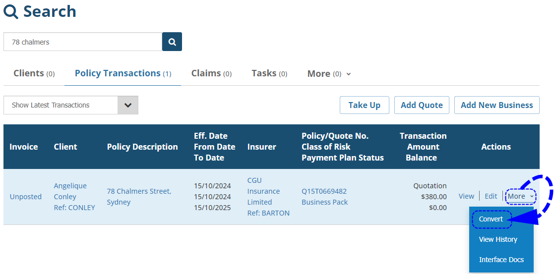 ![]() | Locate the quotation and from Actions, select Convert. or if in the Policy Transaction view, select Menu, then Convert to New Business.![]() |