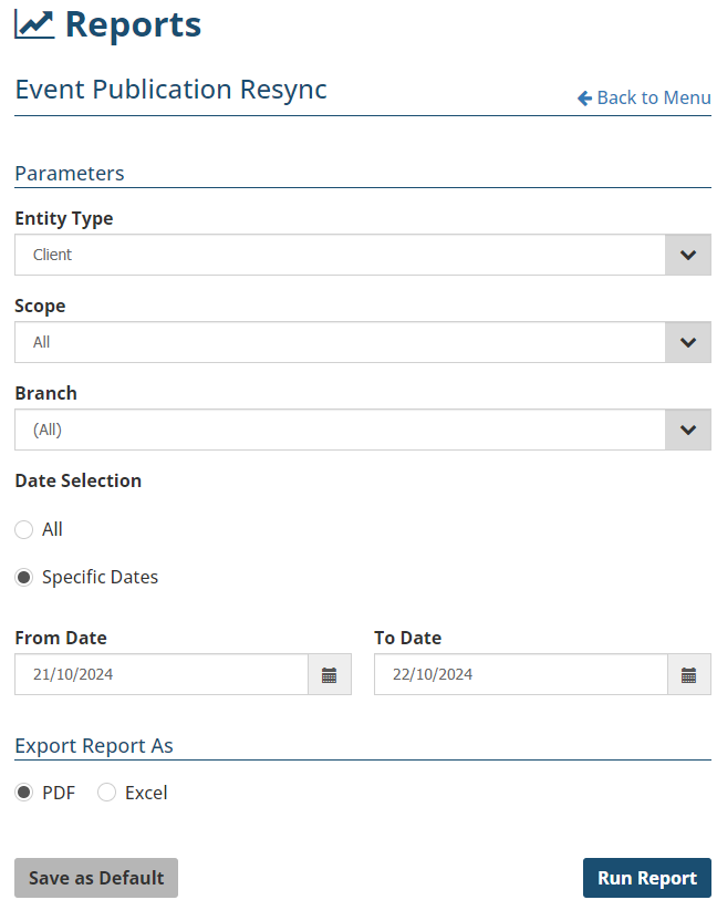 This report is specifically used for ledgers that are working with an external Document Management System (DMS). To ensure a smooth connection between the 2 systems, they must have the same set of events. When a mismatch occurs, running this report re-sends event notifications to the DMS to resync the 2 systems, then generates a report on how many records were sent.