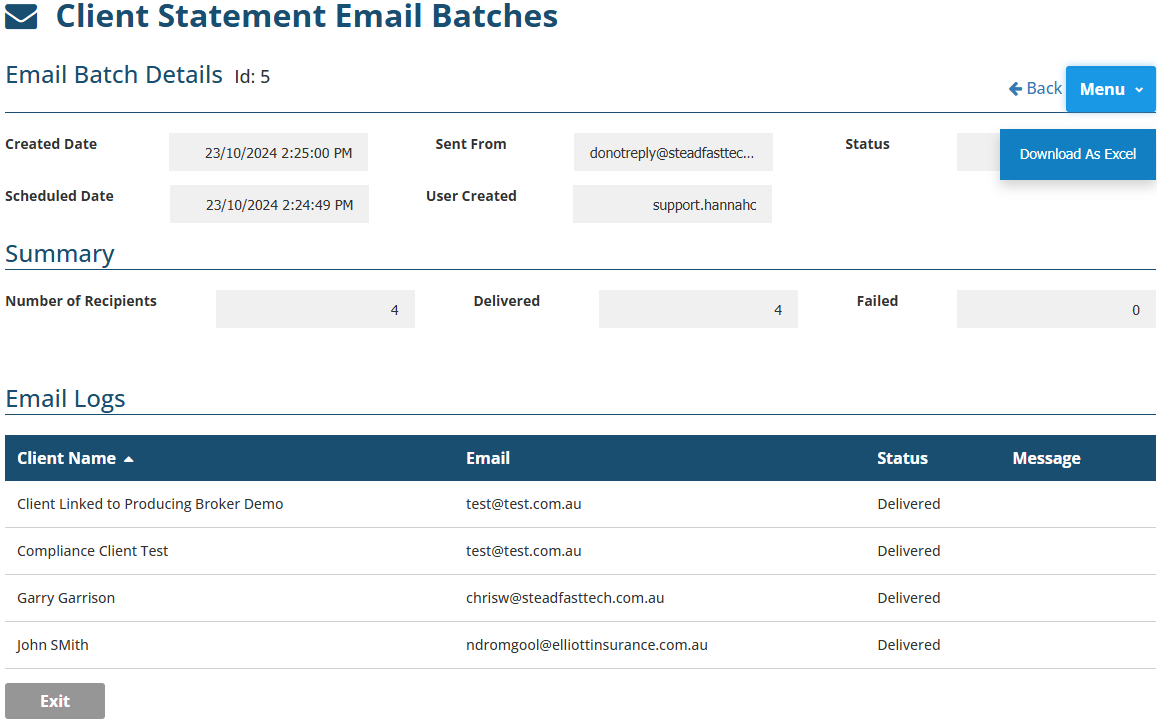 Once you select View, you will see more information regarding the email batch, such as the individual clients, client email addresses and the delivery statuses for each client.