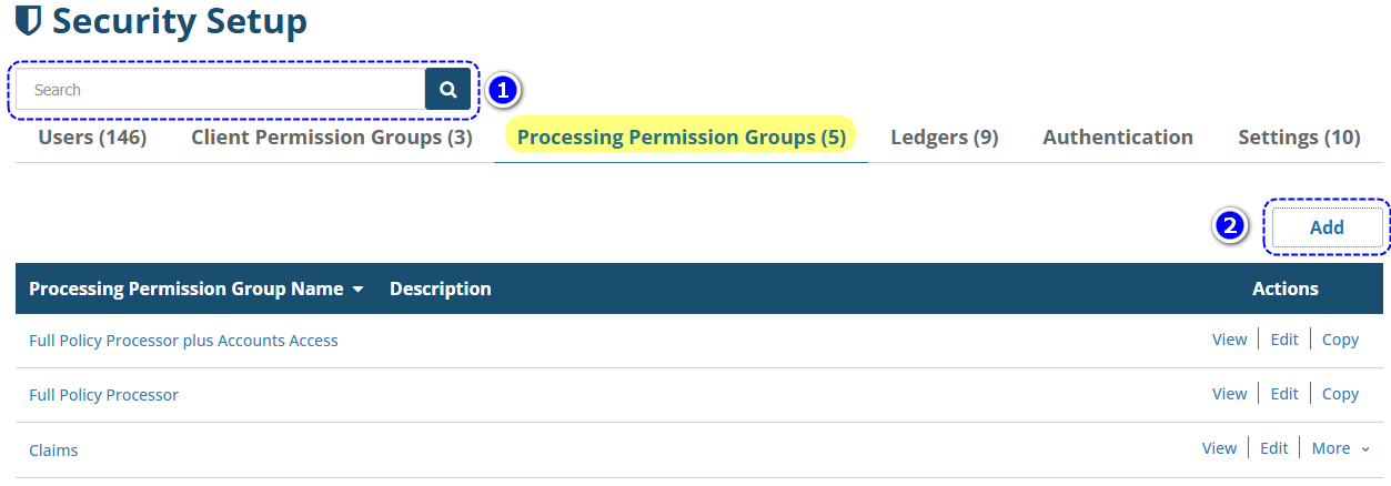 Found under the Setup menu, Security contains the list of all PPGs and is where you can add, edit, copy or delete CPGs. You can use the following to manage PPGs: