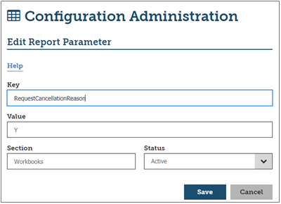 1. In the INSIGHT navigation panel, go to > Setup > Configuration > Report Parameters. 2. Search for or Add the report parameter RequestCancellationReason. 3. Enter RequestCancellationReason in the Key field, Y for the Value, Workbooks for the Section, and select Active for the Status dropdown. 4. Select Save to add your changes. | ![]() |