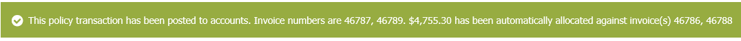 a. In the following example, the information banner advises that Cancellation Invoice 46789 and negative Endorsement 46787 have been automatically applied to Invoices 46786 and 46788.