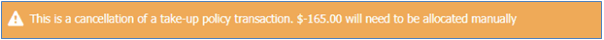 When a full-term Cancellation is posted for a Take-Up or Imported manual policy only, the following warning banner displays at the top of the Invoice Premiums page of the Policy Processing Wizard to remind you to verify the premiums and charges. The message refers to either a Take-up or Imported policy, depending on which applies.