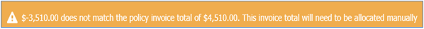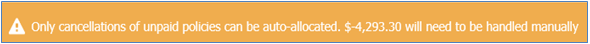 Auto allocation of full-term cancellations only applies when the transactions within the policy term have not been paid (either partially or fully) by the Client. When processing a full-term Cancellation for a policy that has been either partially or fully paid, the following warning banner displays on the Summary page of the Policy Processing Wizard to remind you that the return premium is not automatically allocated.