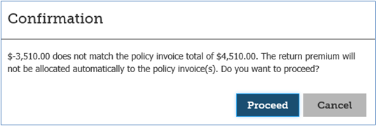 For auto-allocation to complete the total return premium must match the sum of the premiums from the New Business or Renewal and any positive Endorsements. When attempting to post a full-term Cancellation for an unpaid policy where the total return premium does not match the sum of the premiums from the New Business or Renewal and any positive Endorsements, the following confirmation message displays. Example: