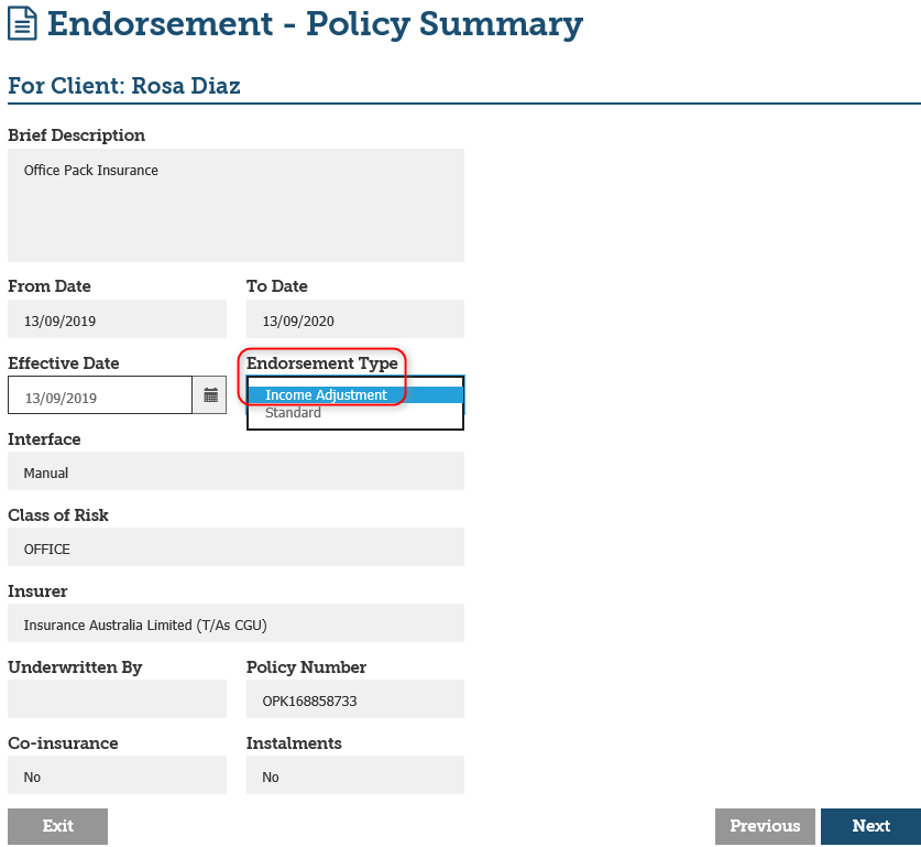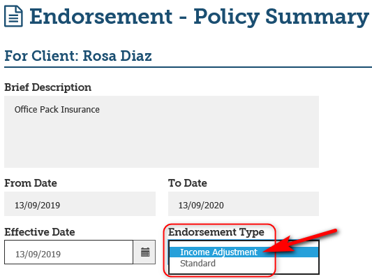 9. INSIGHT recognises an Income Adjustment as a type of Endorsement as per screen shot below.