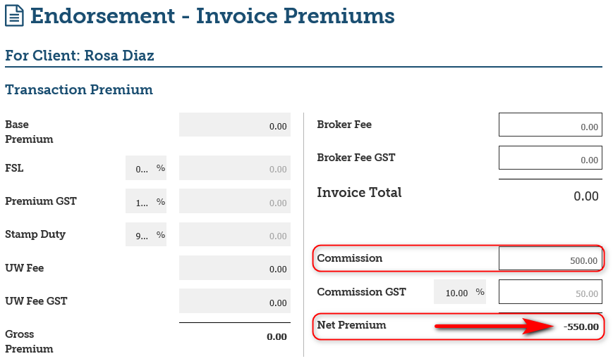 Enter a NEGATIVE amount as the Commission - Notice how the Net Premium is a POSITIVE amount .