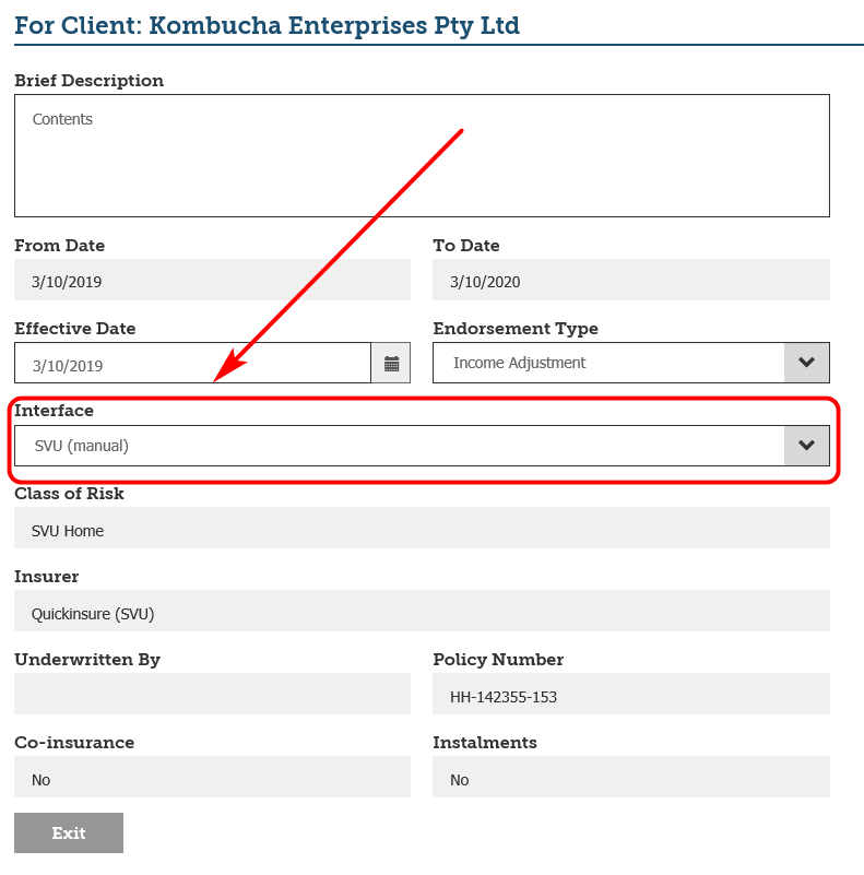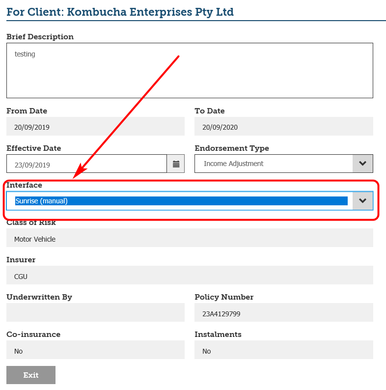 2. When selecting Endorsement Type Income Adjustment INSIGHT will amend the Interface to SCTP (manual) / Sunrise (manual).