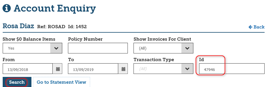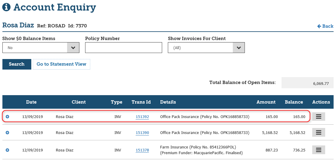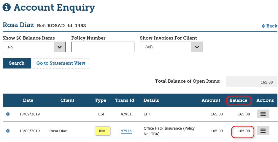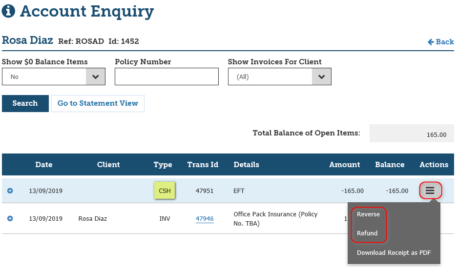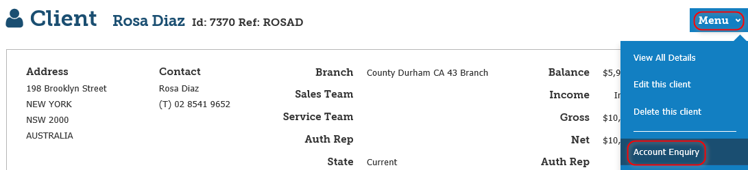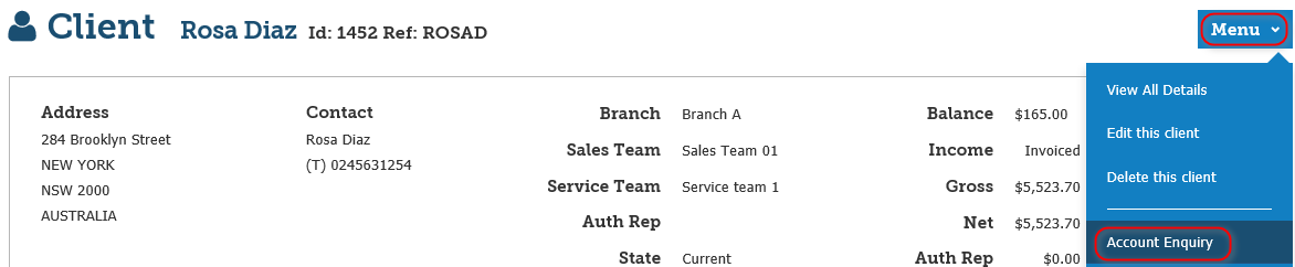 1. View the client the invoice belongs to, select Menu and Account Enquiry.