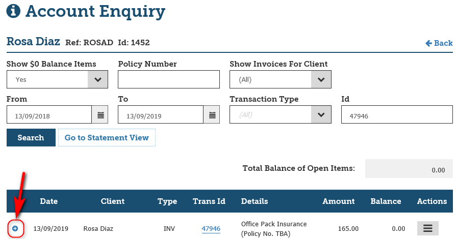 4. The search results will display the Invoice number – select the plus sign to display more information regarding the Invoice number.