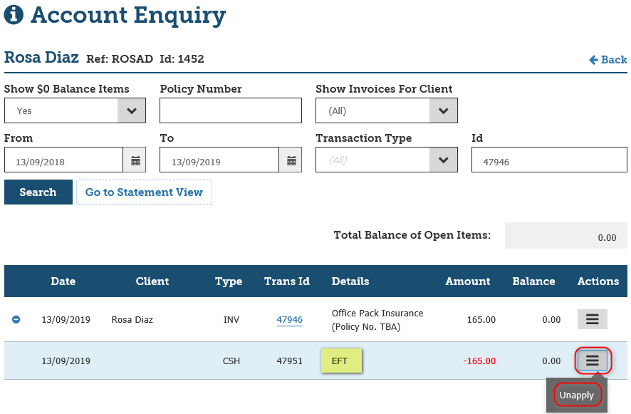 This completes the process for unapplying the receipt from a broker fee only invoice. From here the receipt can either be Refunded to the client or Reversed from the system.