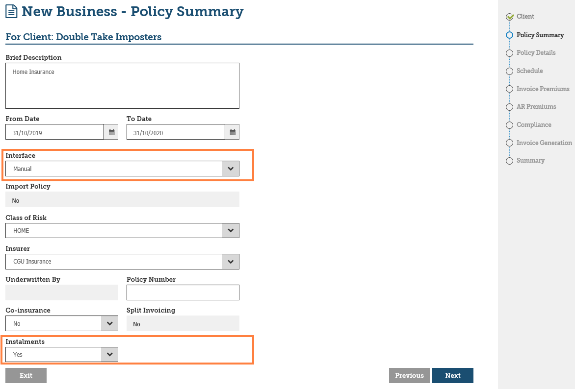 Sunrise Instalment-billed policies are created in the same way as a manual INSIGHT policy.
