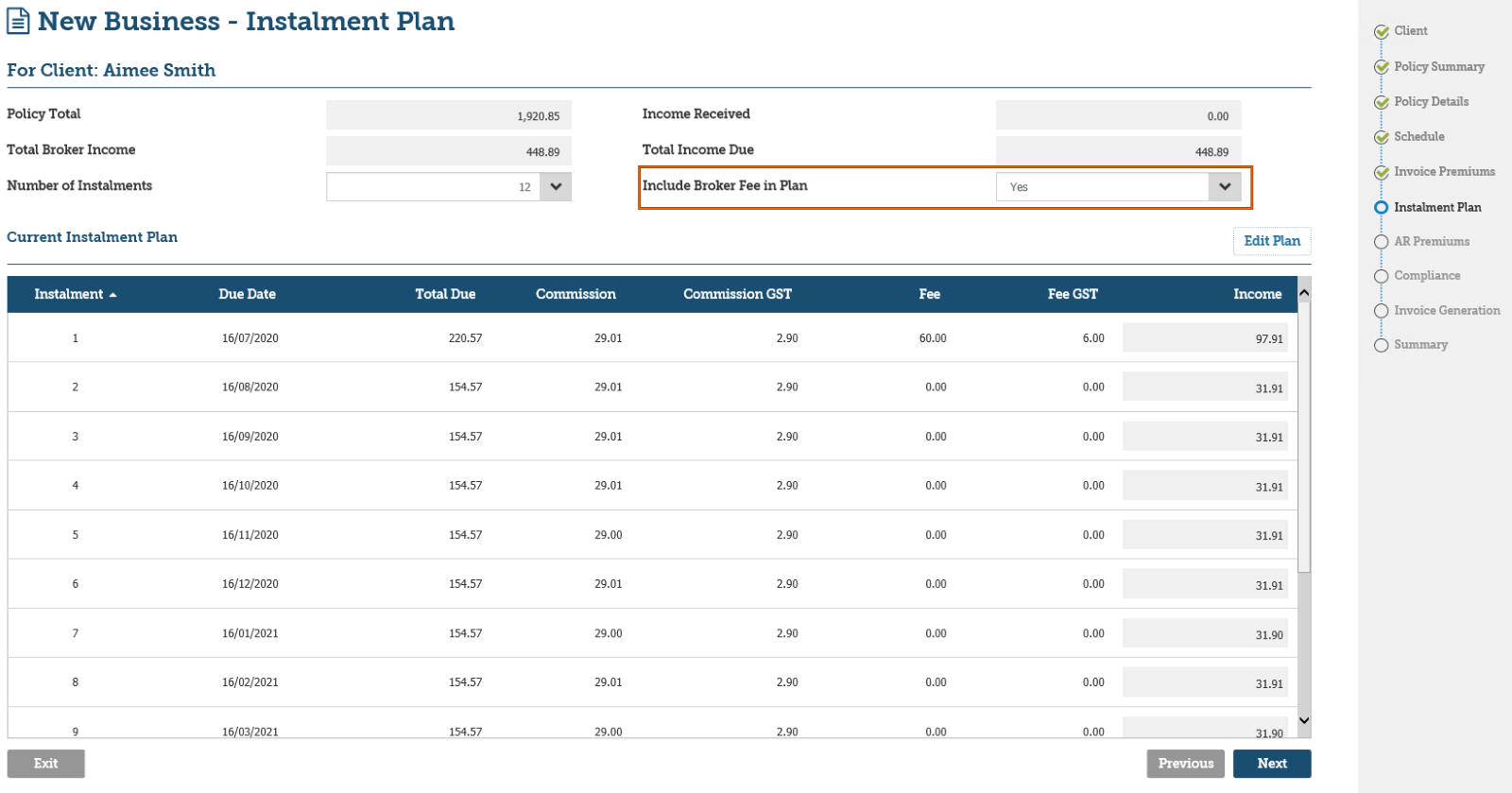 The Broker fee may be included in the first instalment of the plan by selecting Yes on the Include Broker Fee in Plan drop down.