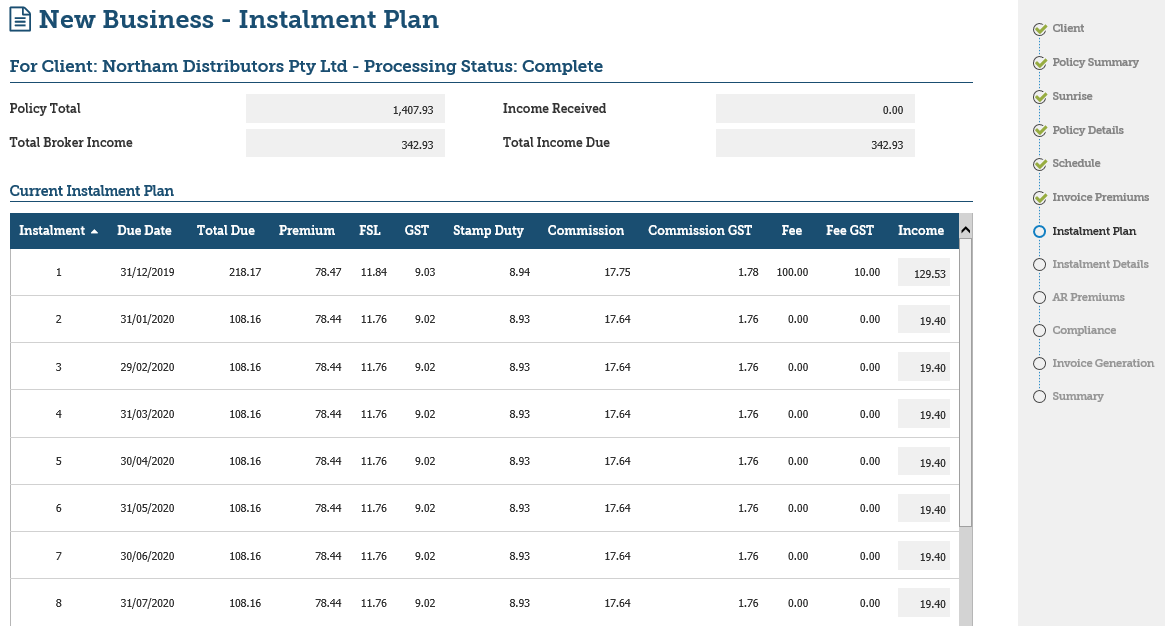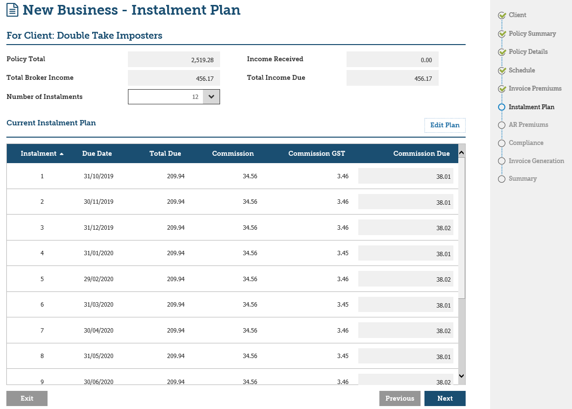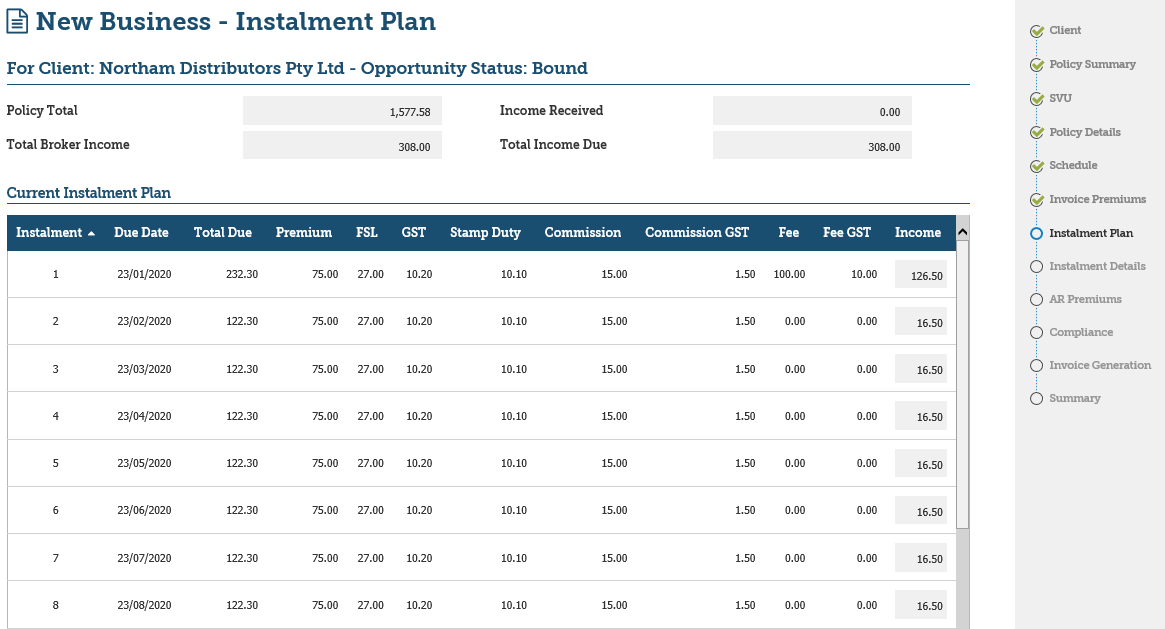 10. The Policy Wizard is updated with the Instalment Plan and Details page.