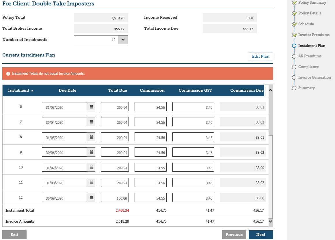 4. If required, select Edit Plan to activate the Instalment Plan in edit mode. This enables the Plan to be updated to match the Instalment Plan supplied by the Insurer and ensure Instalment totals matches the Invoice amount, this validation means you will not be able to complete the wizard until the amounts match.