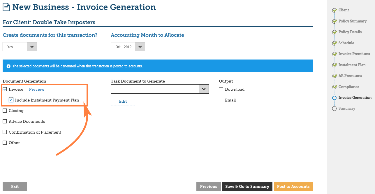 14. Select Next and continue to the Invoice Generation page. The policy can be posted to accounts and the appropriate documentation can be produced.
