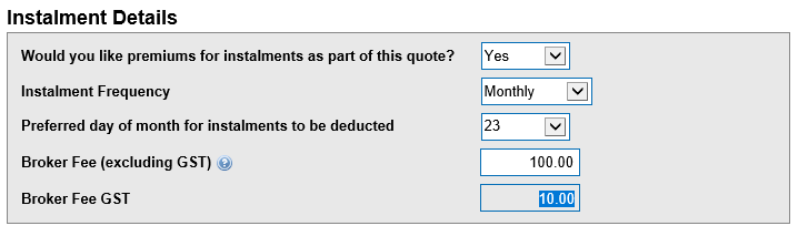 4. In the Instalment Details section, set the options as follows to initiate Instalment Billing. The insured can nominate the preferred day of the month for the deduction to occur. The Broker Fee may also be entered.