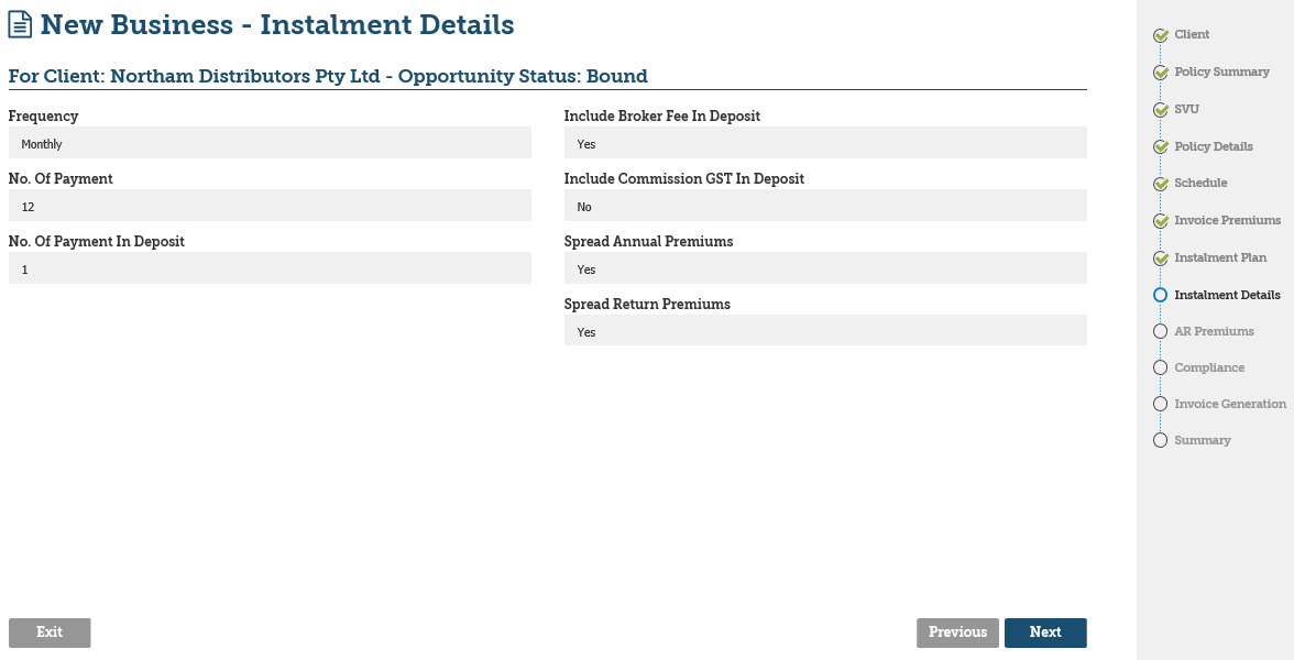 10. Proceed through the Policy Wizard. Note: The Instalment Plan details are displayed in the Policy Schedule step of the Policy Wizard.