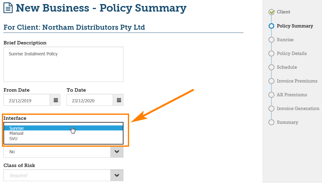 2. Proceed with entering Class of Risk and set Interface type to Sunrise .