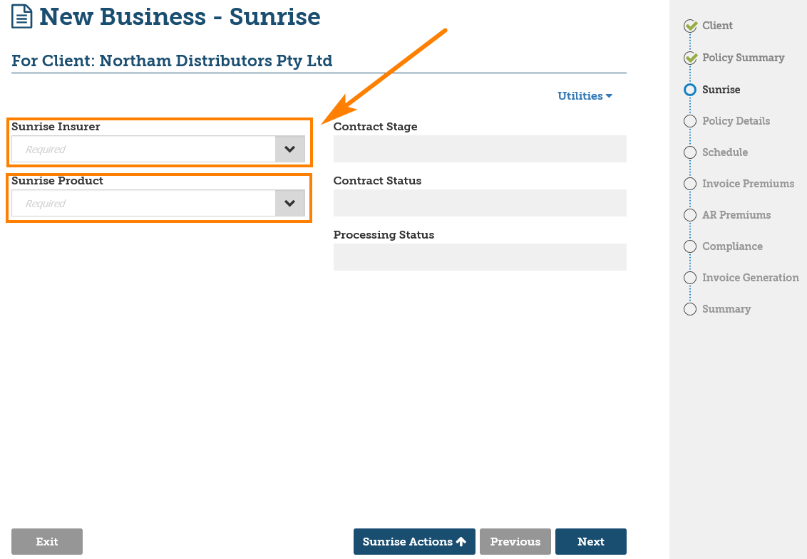 4. On the Sunrise Wizard, select the insurer and product required and proceed to access the Sunrise Insurer product.