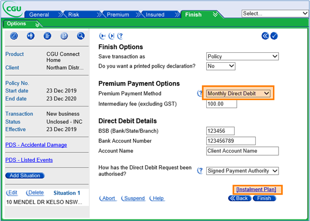 5. Enter the insurance coverage details and continue through the insurer’s product to the Payment or Finish tab, as shown below, and set the Payment Method to Monthly Direct Debit.