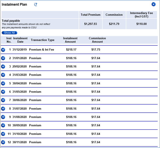 The Instalment Plan displays the financial breakdown of the policy transaction(s). There is only one Instalment Plan for a policy period and the Plan updates to reflect the impact of any Endorsements made.