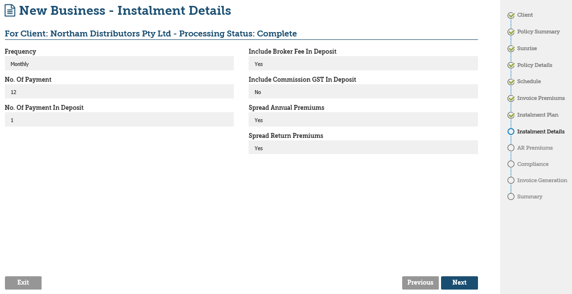 13. Select Next. The Instalment Details page is displayed as follows. These details are provided by the insurer’s product and are not editable: