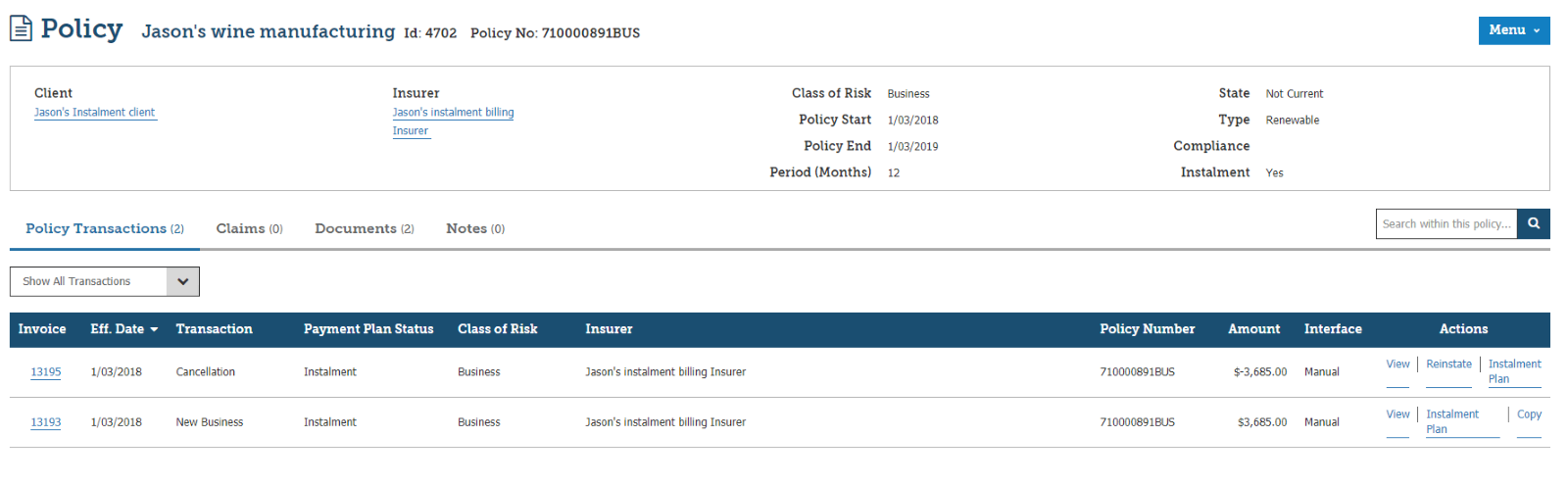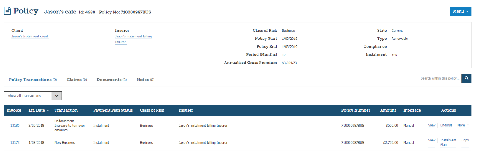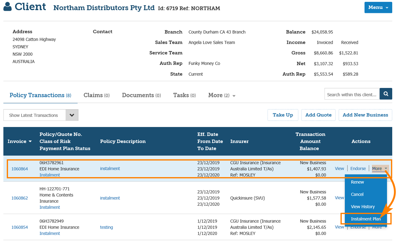 2. The Client details page is displayed listing the latest policy transactions. Policies that have Instalment Billing setup display a link to the Instalment Plan. The plan can also be accessed from the Action menu as displayed below: