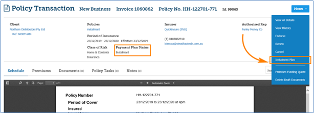 4. The Policy Header is also updated with the Instalment Plan’s status.