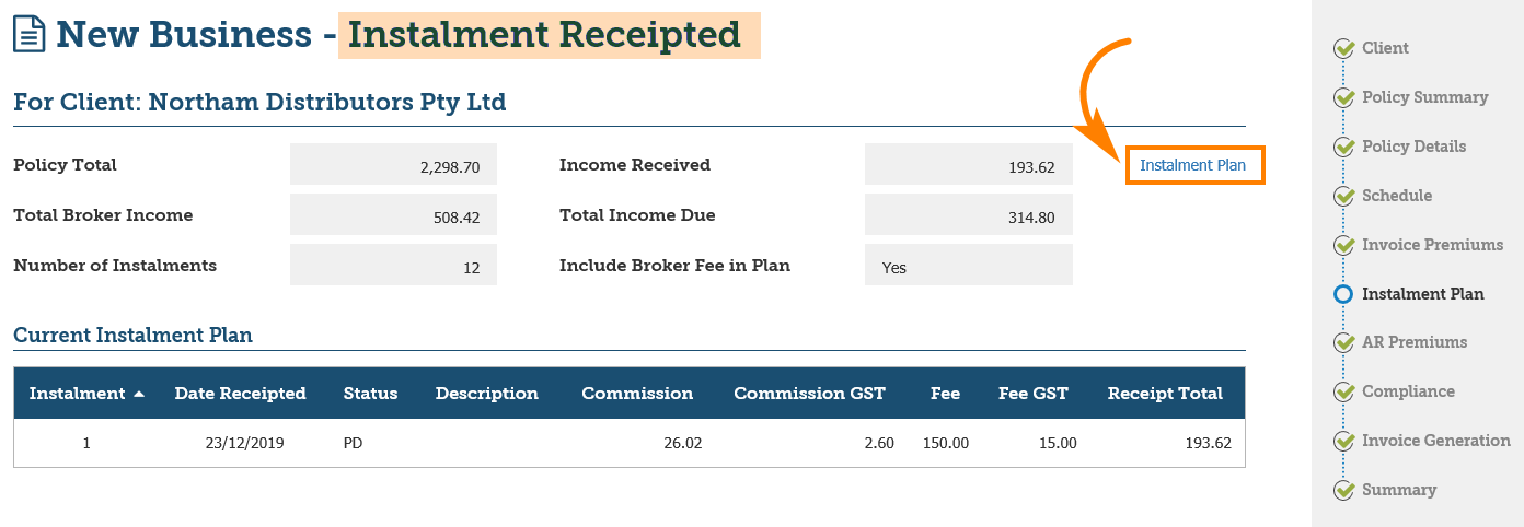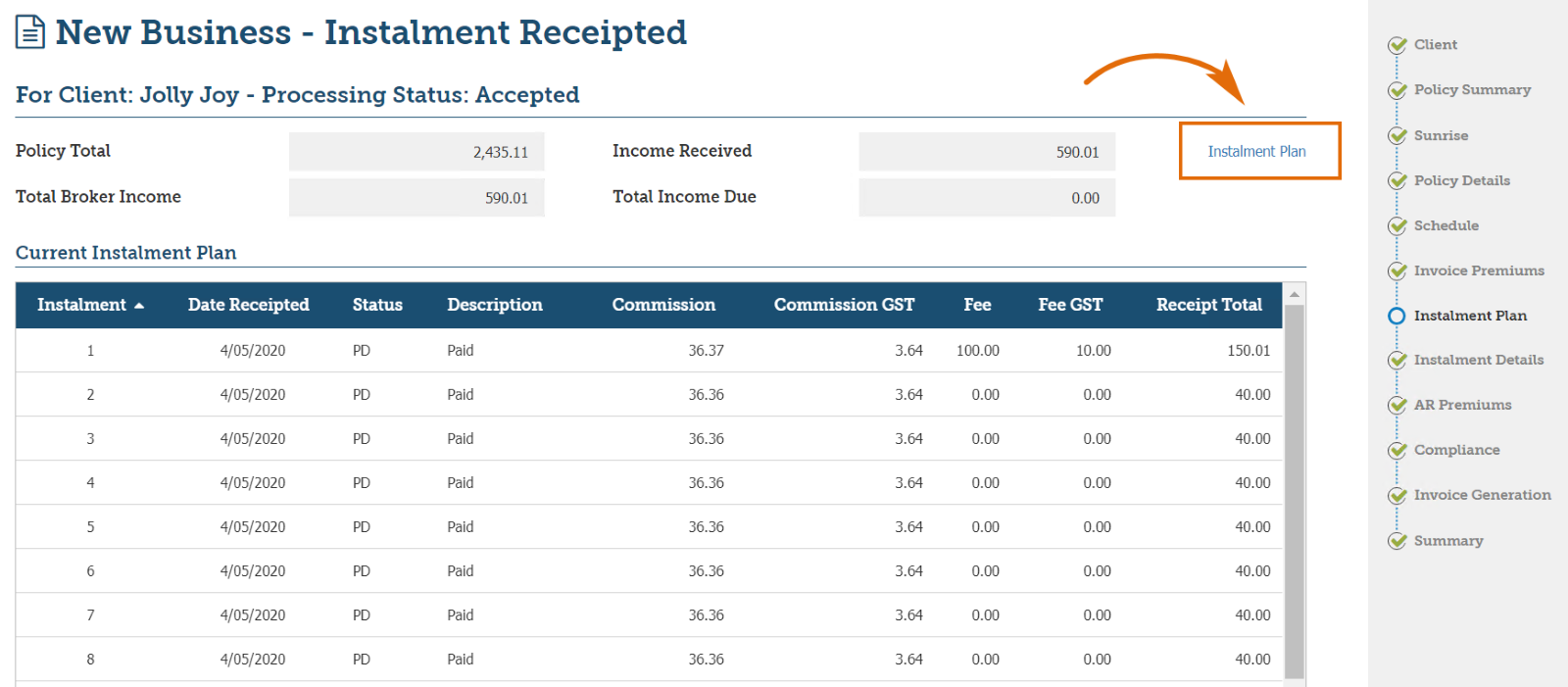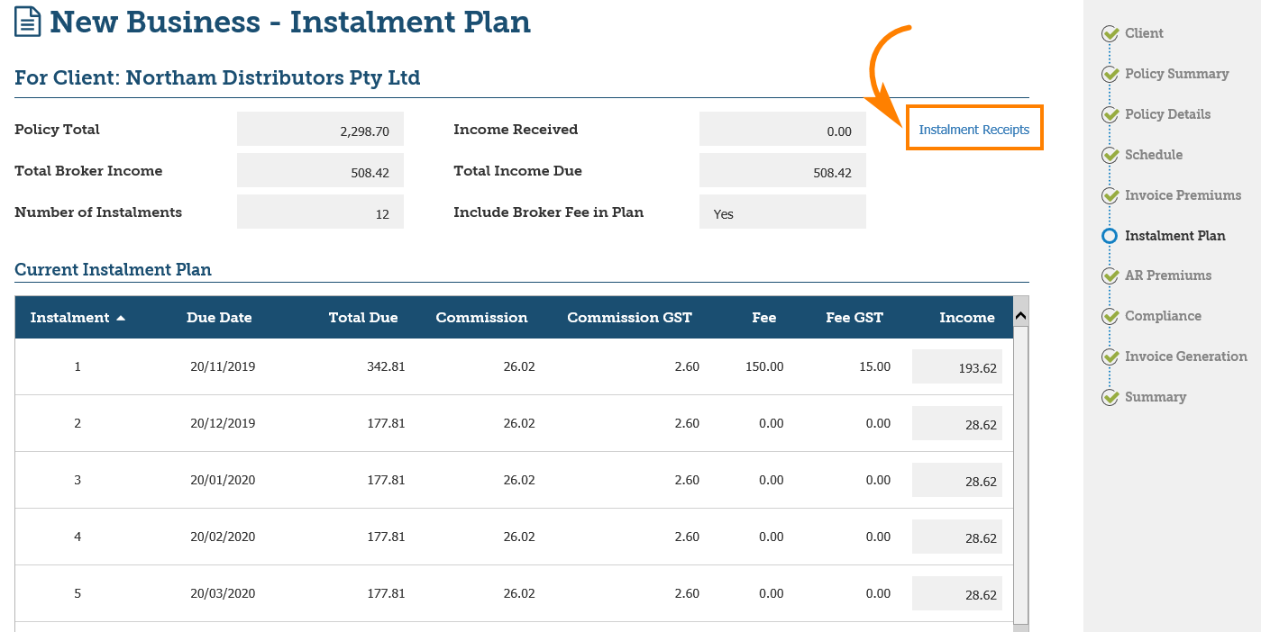 12. The header section of the Instalment Plan shows the Policy Total, Income Received, and Outstanding. These fields update as instalment payments are receipted.