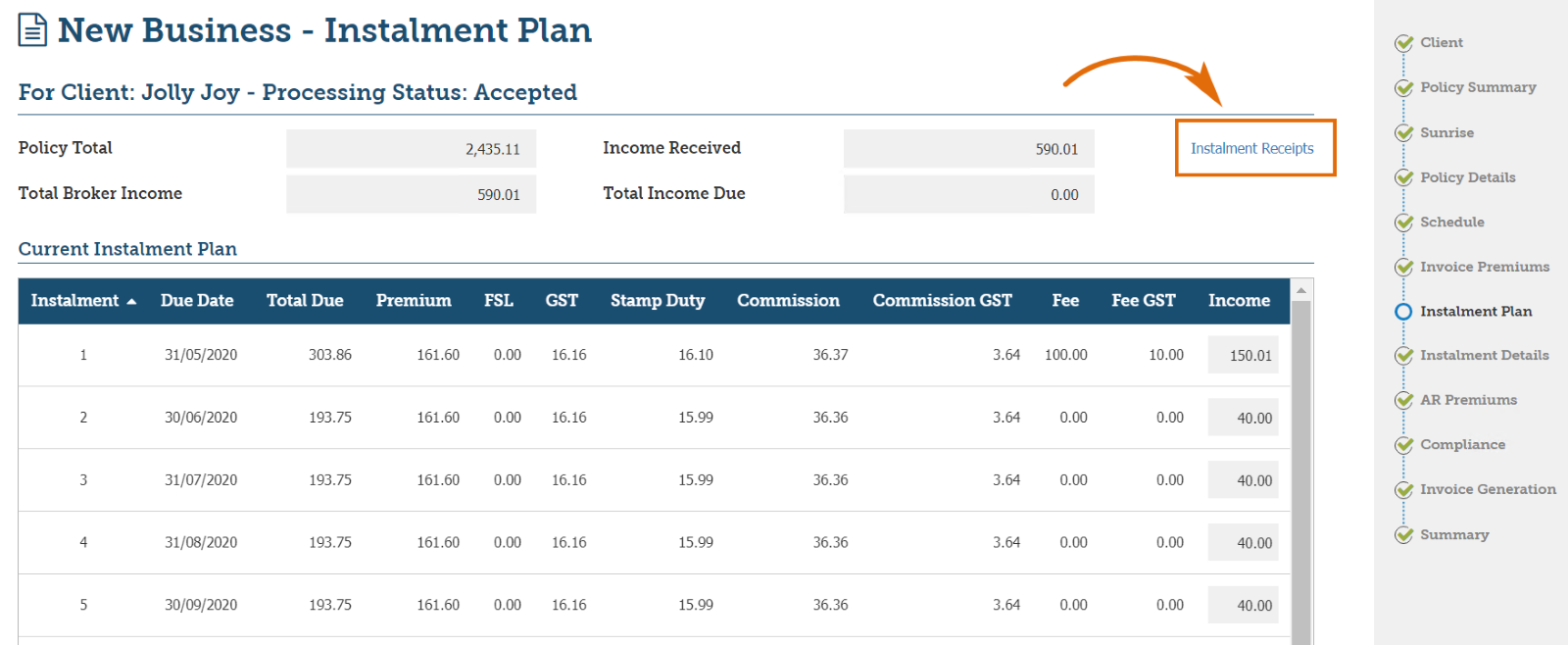 12. The header section of the Instalment Plan displays Policy Total, Income Received, and Outstanding. These fields update as instalment payments are receipted.