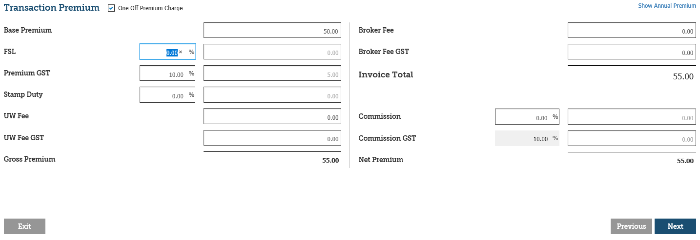 1. To complete endorsement as “one off premium charge” on the Invoice premiums page, tick the box next to transaction premium: