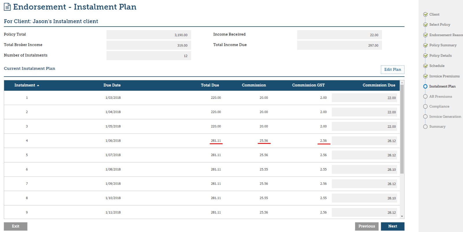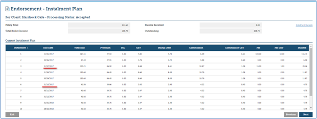 In the below example, the instalment values increased for the fourth instalment due to the extra premium endorsement.