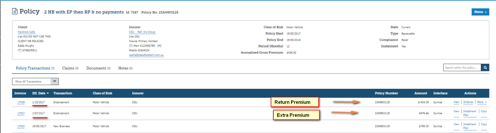 NOTE: The schedule will need to be edited to remove the previous plan.As per the New Business transaction, the Invoice will contain the Broker Fee and Broker Fee GST amount to be payable to the Broker and will also details the overall policy premium amounts Below is an example of the Policy Transaction view when a New Business is followed by an extra premium Endorsement: