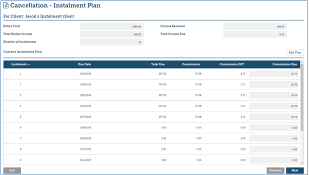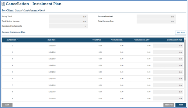 If the cancellation date was mid-term, the Instalment Plan displays the original values for the instalments prior to the cancellation date and then $0.00 instalments beyond the mid-term cancellation date. The Plan can be edited to reflect any altered Instalment Plan details and to align with the overall premium totals, based on the Cancellation details supplied by the Insurer.