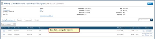 Shown below is a full-term cancellation for an instalment-billed policy with no instalments receipts received from the insurer.