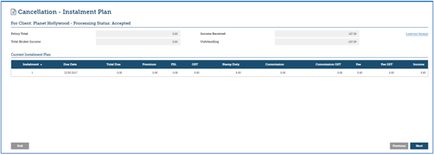 If the cancellation date was mid-term, the Instalment Plan displays the cancellation values from the appropriate instalment number in the plan.
