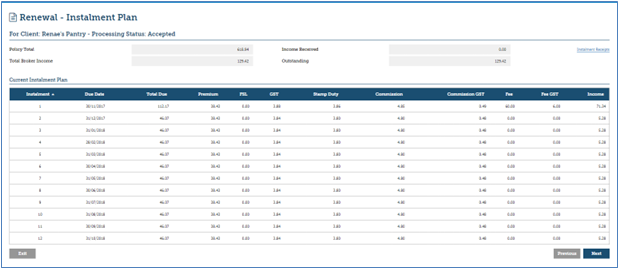 The policy is renewed in the usual manner after the renewal has been downloaded by the insurer to INSIGHT. The renewal transaction will display a new instalment plan. Any previous policy’s instalment plan or payments that have not been completed are not affected by the new renewal instalment plan.