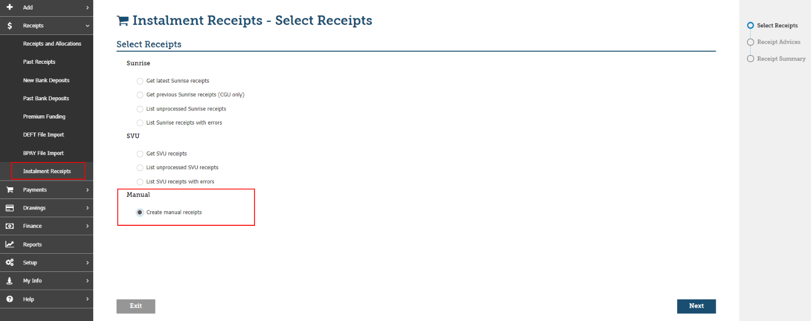 The Instalment Receipts page enables you to create manual receipts for Manual Instalments in addition to existing receipting you may perform for Sunrise or SVU Instalment policies.