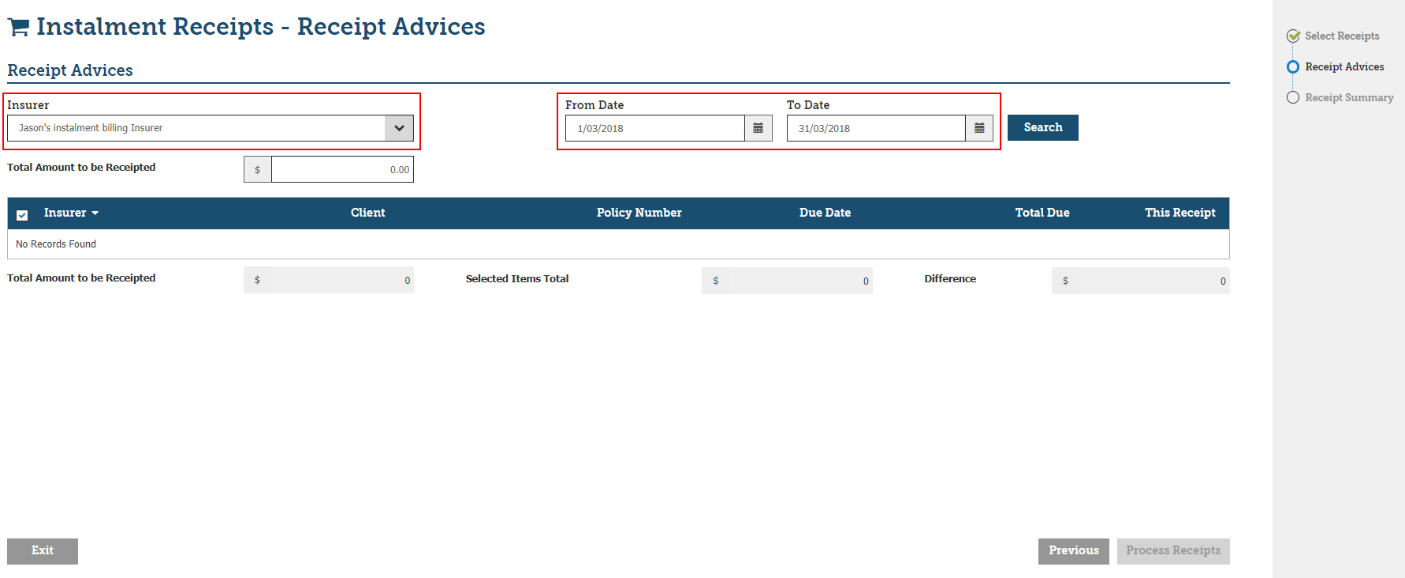 2. Instalments must be receipted for each Insurer separately. On the Receipt Advices page, select the Insurer and instalment due date range to be receipted and click Search.