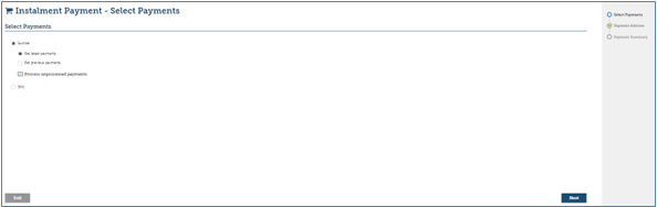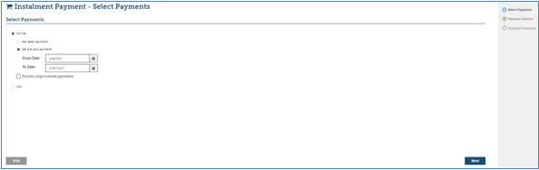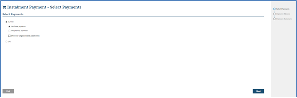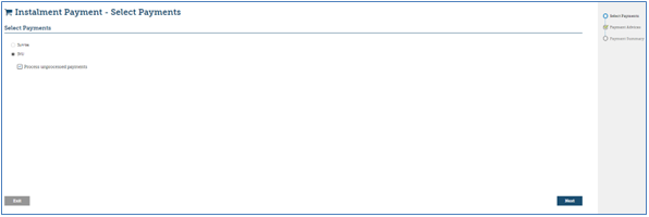 The Instalment wizard then displays the Payment Advice page. You can then proceed with selecting the new payments and imported but not processed payments.