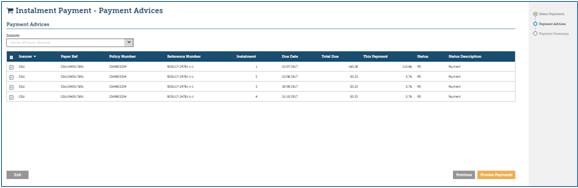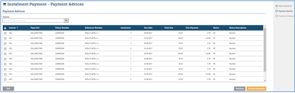 3. The Instalment wizard displays the Payment Advice page listing the payments to be processed.