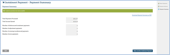 This Payment Summary page displays the Total Payments Processed and the Income Earned for this current instalment payment import.