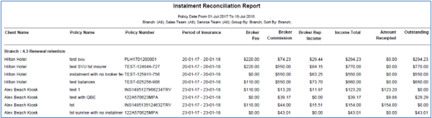 This report displays the Brokers income, the amount receipted via the Instalment Payment Receipt process and the amount outstanding to the Broker. The report has also various filters to enable you to run the report using date selection, Branch, Team and grouping selections. Note: Use future From and To dates to produce the report for current policies. The report can be produced in PDF or Excel format.