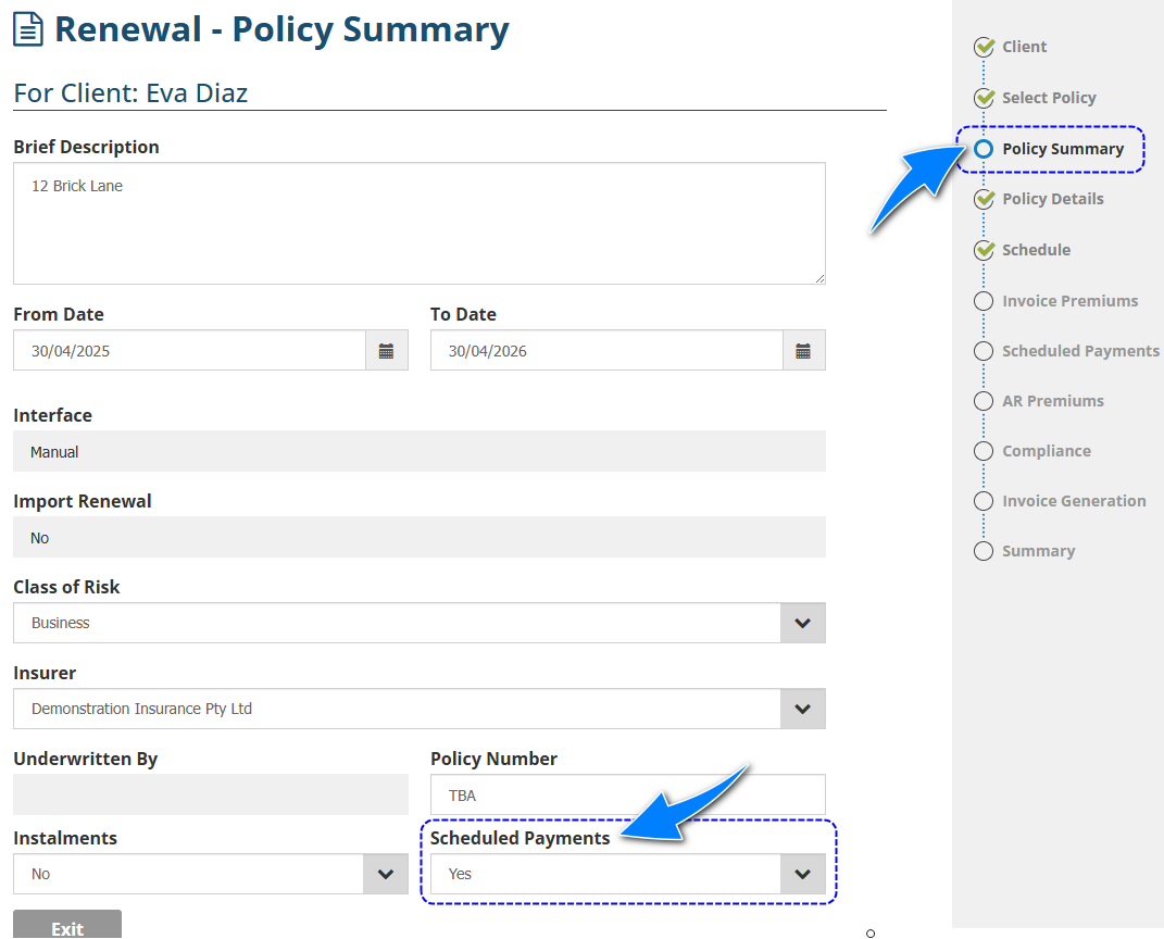 Enter information as per normal in the Policy Summary page of the wizard. At the bottom of the page, locate the Scheduled Payments field and select Yes - this will add the Scheduled Payments page and its features.