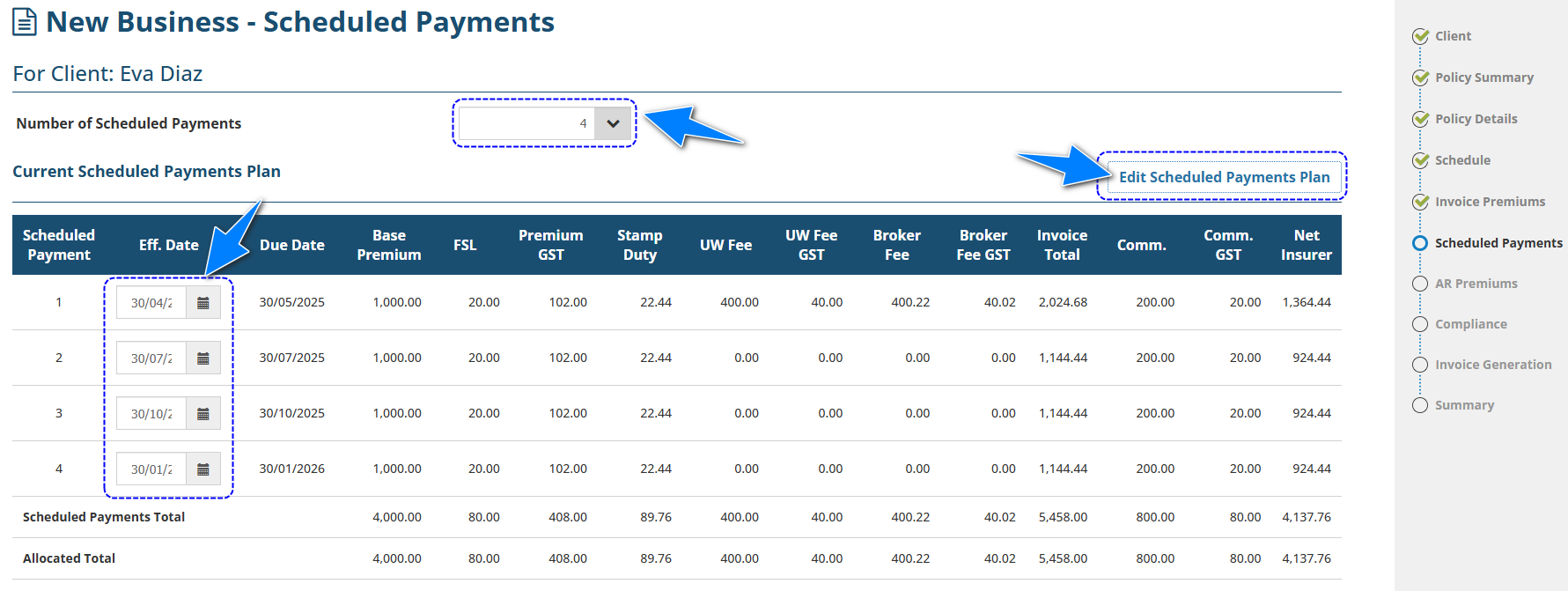 Scheduled Payments introduces the ability to split premiums across multiple invoices, with separate due dates and credit terms for the configured Classes of Risks.