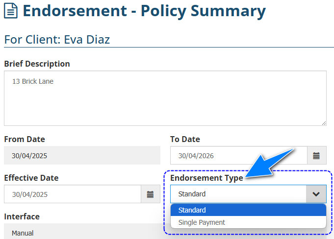 ![]() | Single Payment: | Does not adjust the scheduled payments amounts; Collected as a single payment of a standalone endorsement. Use this type of endorsement when making a previous period adjustment for Workers Compensation - this likely when you are wanting to refund or get extra premiums and not adjust the amount of the last payment. |