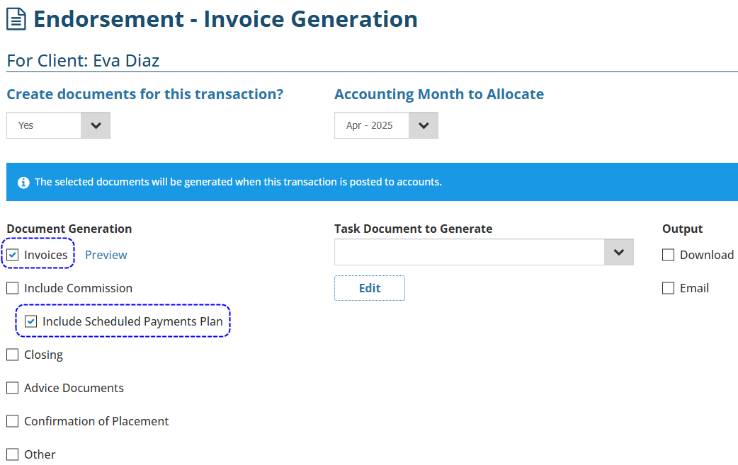 Selecting the Include the Scheduled Payments Plan will insert the plan underneath the schedule. When endorsing, please ensure that you remove the previous plan inserted in the Schedule page, so that there is only the latest plan when the new plan is inserted.