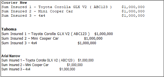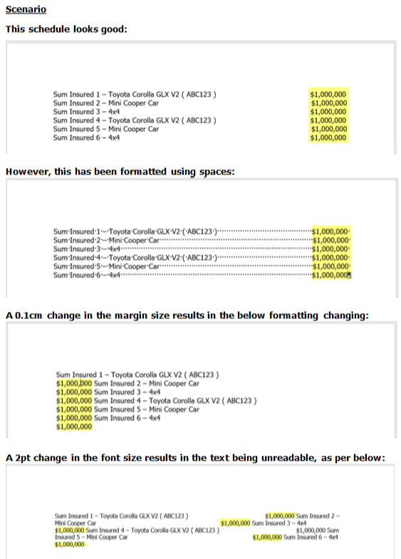 - For example, changing fonts in a schedule from your previous broking system may result in pushing out the text alignment.